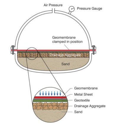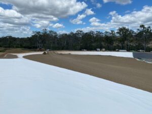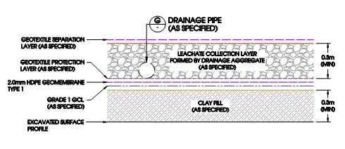 2. A Protection geotextile to protect the HDPE from the filter layer above. The filter layer is a coarse gravel which is placed under the landfill materials to collect the liquids (leachate) which separates out from the solids. The protection geotextile is tested under pressure with the HDPE and the filter gravel to verify its characteristics